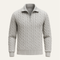 Details: Cable-knit pattern, zip-neck collar, ribbed cuffs and hem